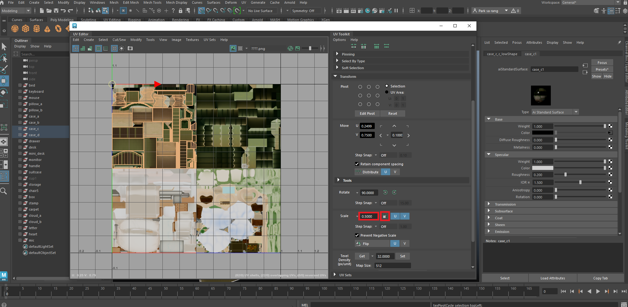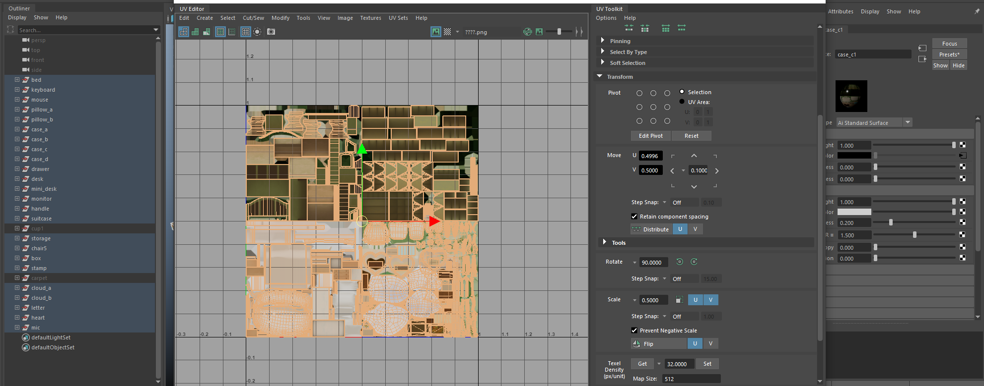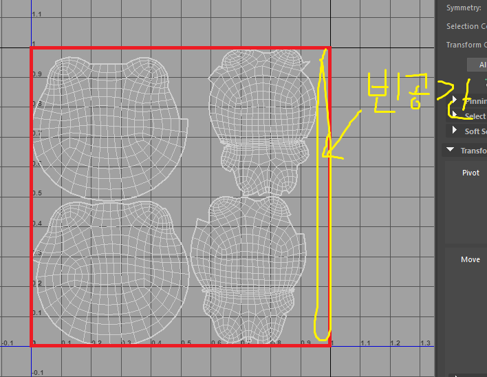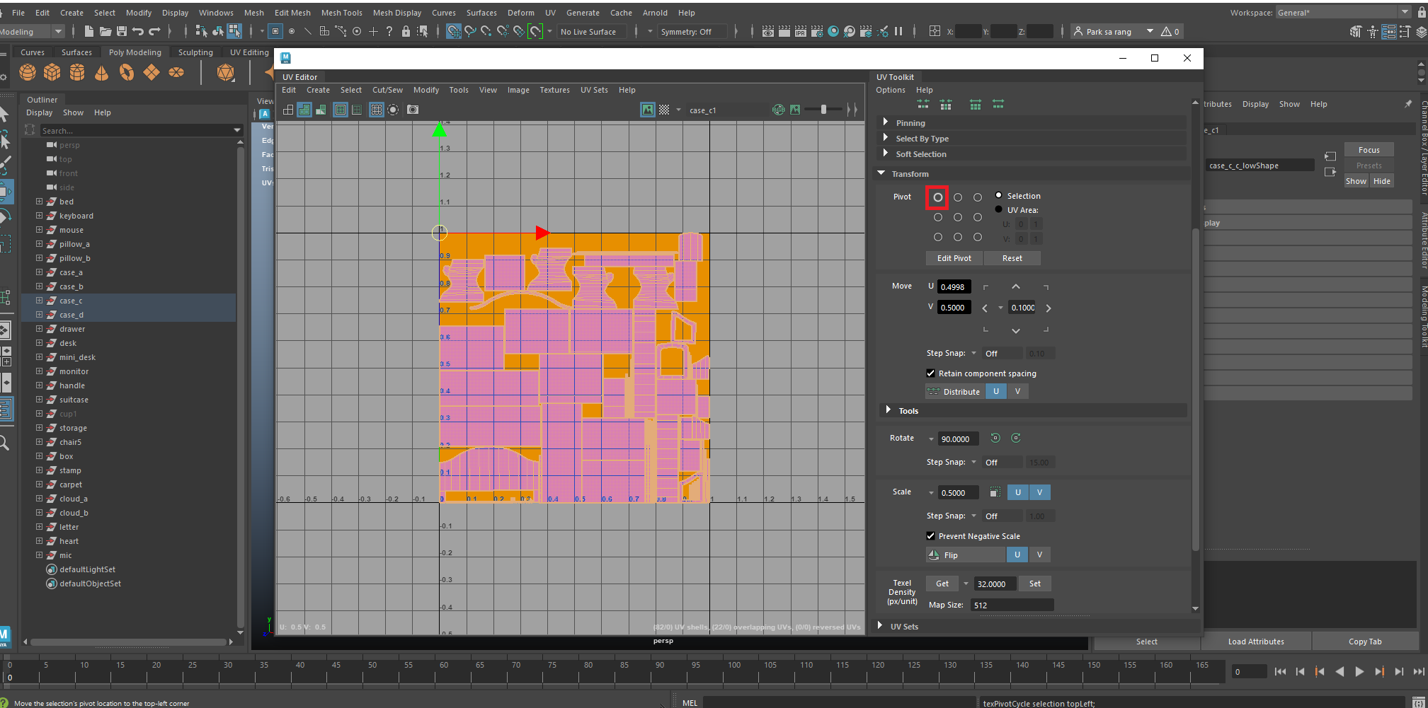 왼쪽 위에 배치할 UV들을 선택하고 UV Toolkit의 transform 창에서 pivot의 위치를 변경한다. 왼쪽 맨위 피봇을 선택해 피봇 위치를 변경한다. (UV Toolkit 창이 안뜬다면 그냥 UV Editor 창을 지우고, 다시 불러온다)