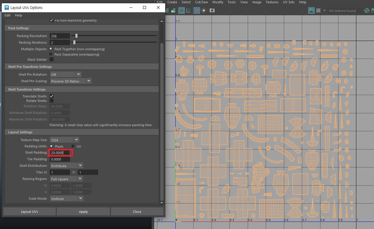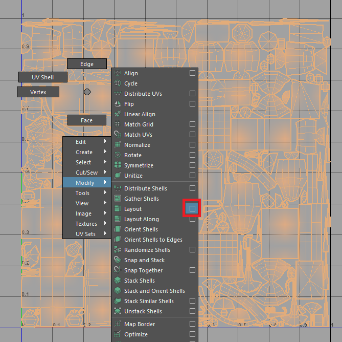 이렇게 촘촘한 UV가 있다. layout 옵션창을 눌러보면